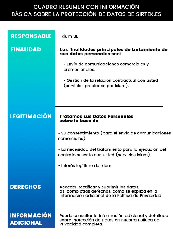 En cumplimiento de lo establecido en el Reglamento (UE) 2016/679 del Parlamento Europeo y del Consejo de 27 de abril de 2016 relativo a la protección de las personas físicas en lo que respecta al tratamiento de Datos Personales y a su libre circulación, así como cualquier otra normativa aplicable en materia de Protección de Datos, facilitamos a continuación información ampliada en la presente Política de Privacidad, así como un cuadro resumen adicional al final de este texto.
